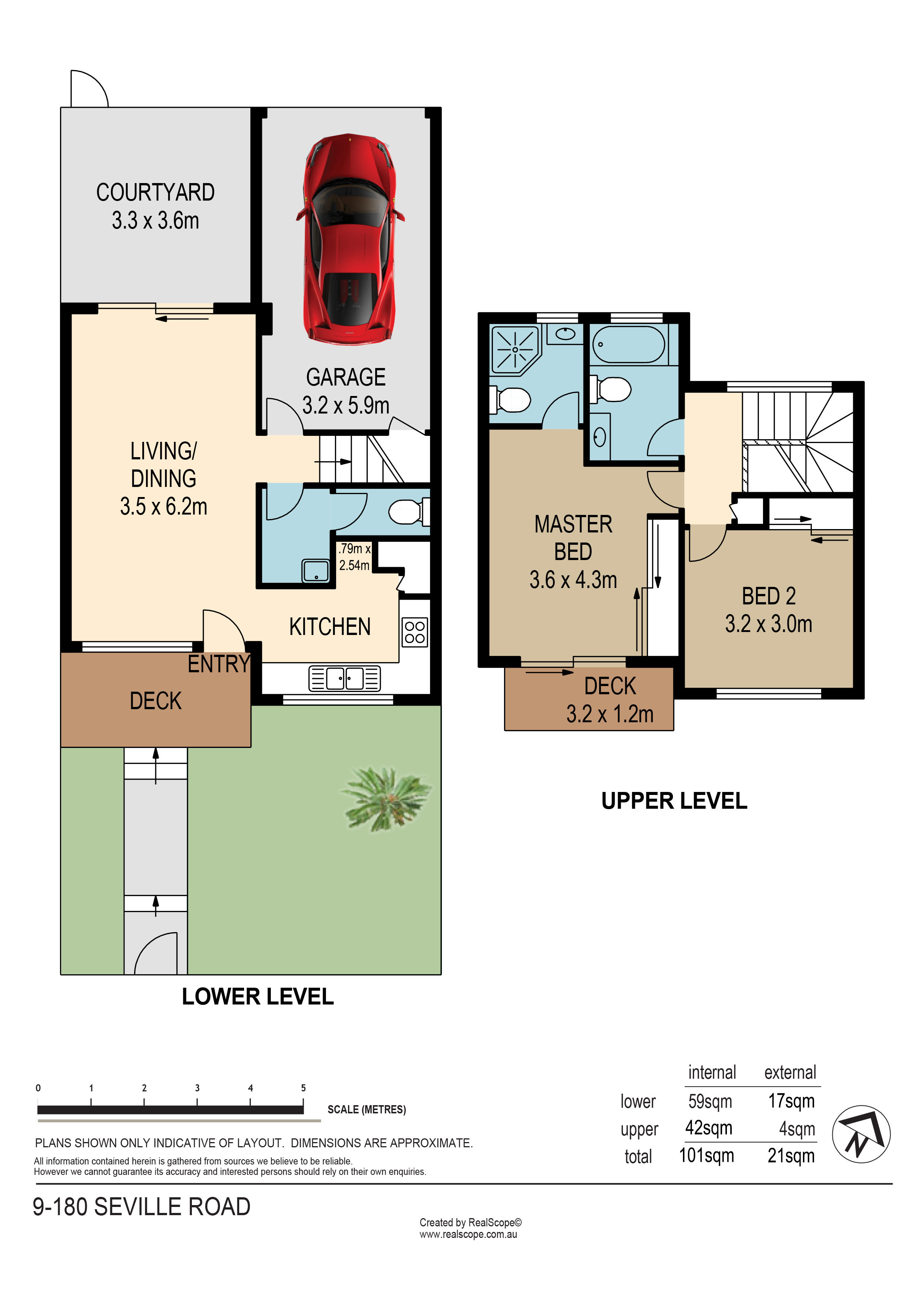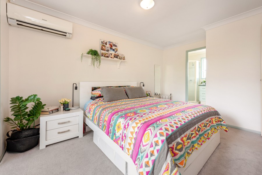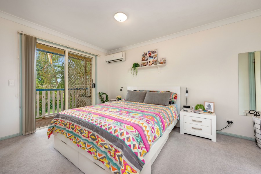 Two carpeted bedrooms and two bathrooms occupy the upper level. The large air conditioned master bedroom features a separate ensuite, a wide built in wardrobe and a private, intimate balcony.